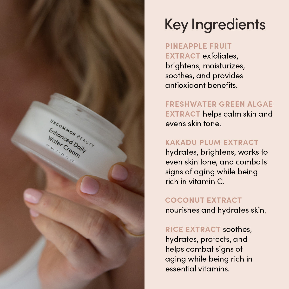 - Our Enhanced Daily Water Cream is free from any added synthetic fragrances, ensuring a comfortable and gentle experience for all skin types.