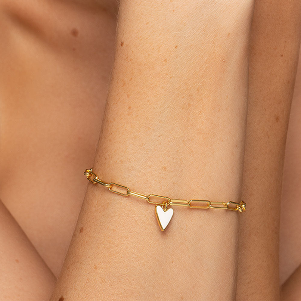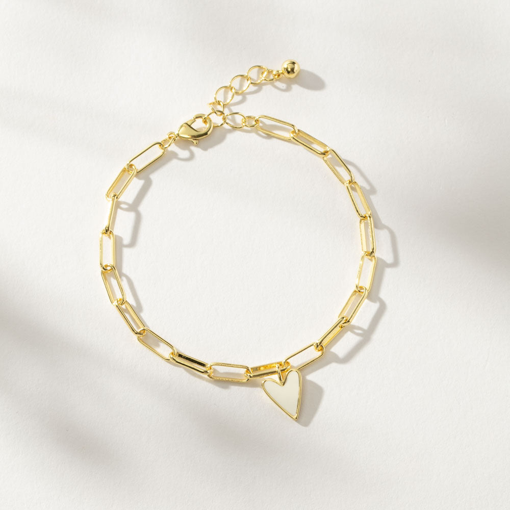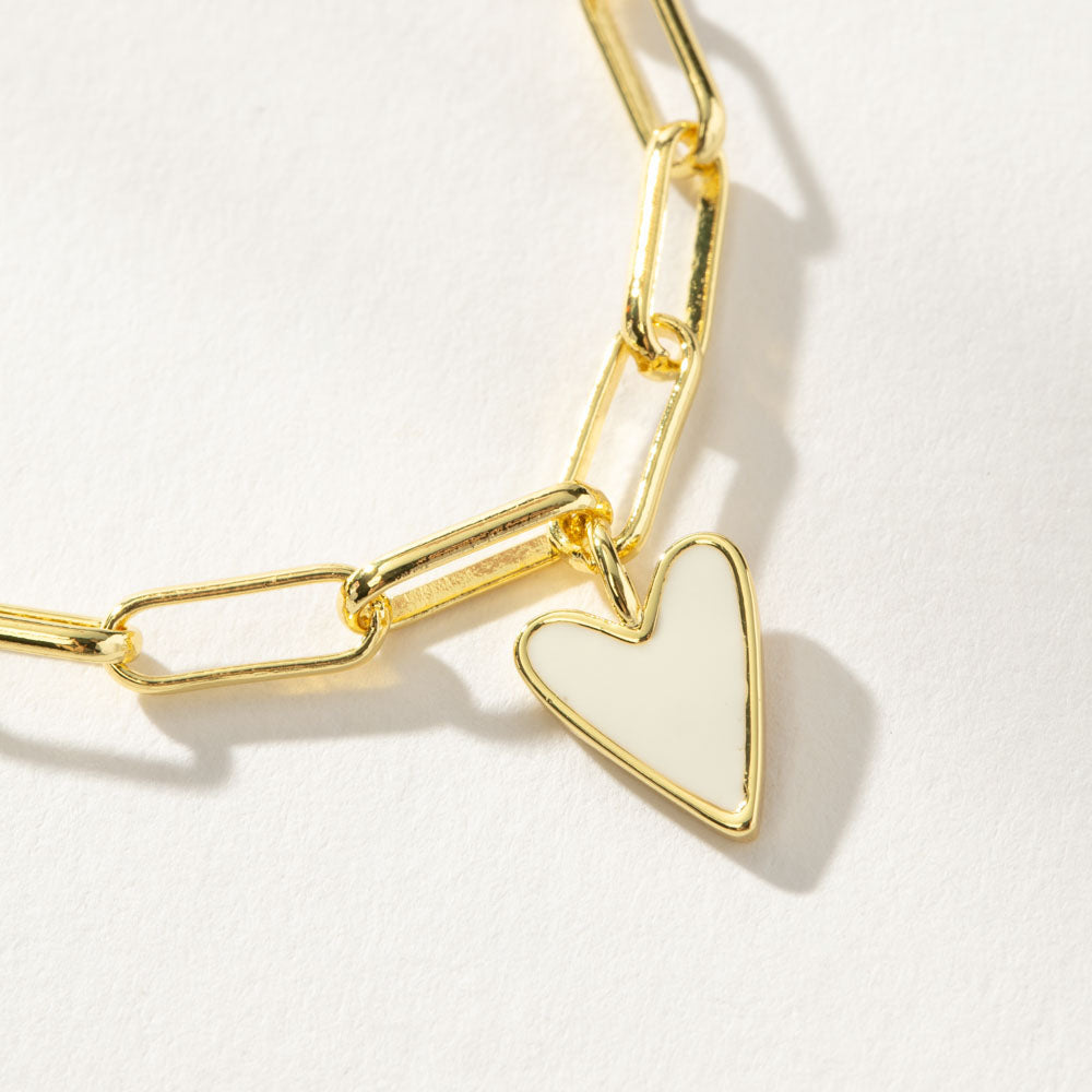 - An enamel white heart charm hangs from a paperclip chain bracelet